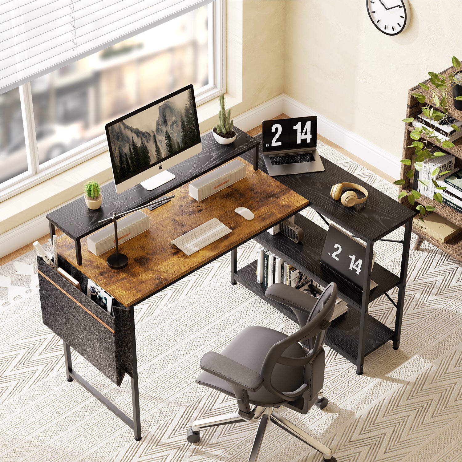 COKOS Escritorio para Computadora en Forma de L con Estantes, con Puertos USB y Bolsa de Almacenamiento Escritorio de Oficina en Casa con Soporte para Monitor 120x83x88cm(Vintage+Negro)